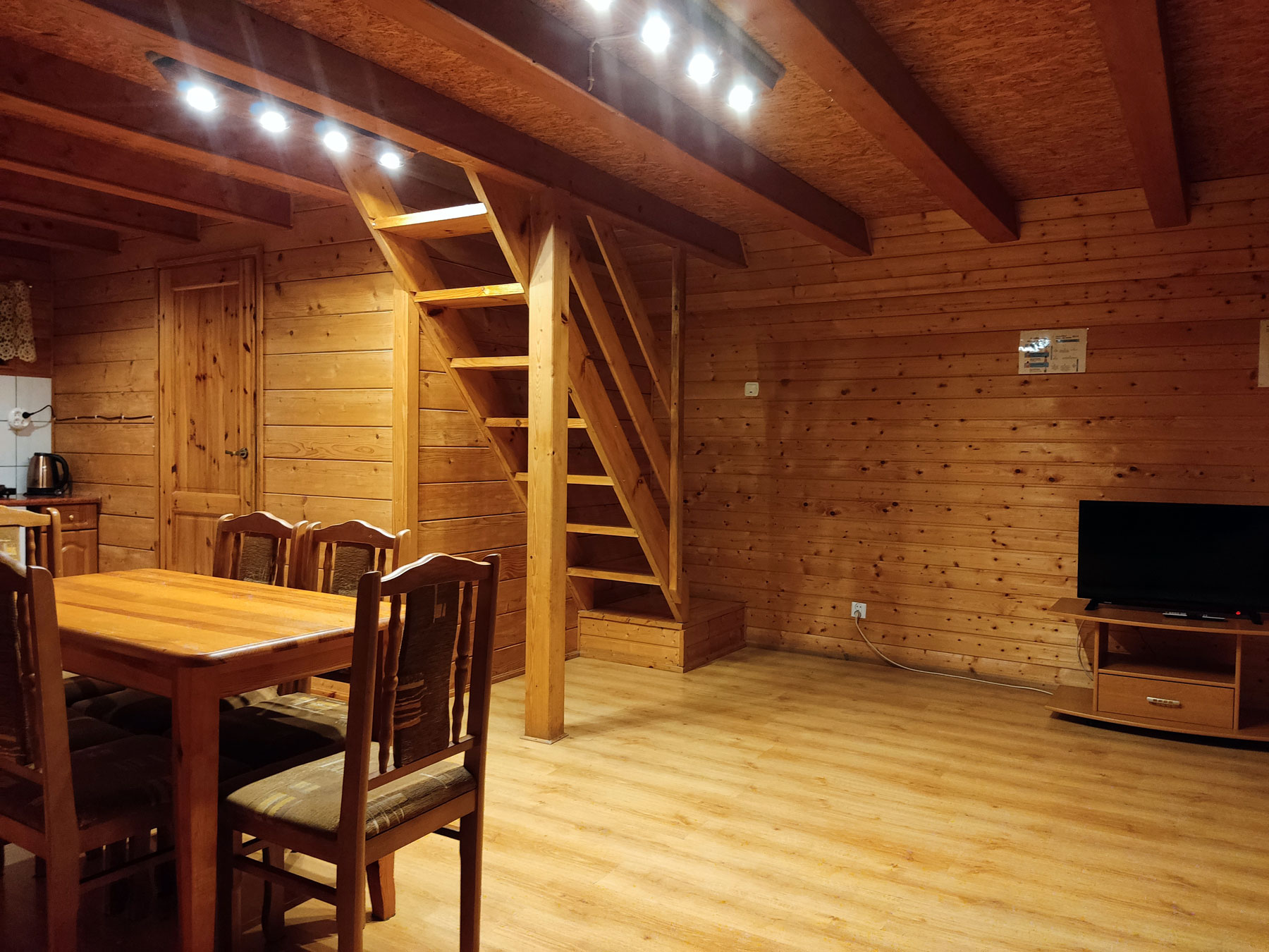 Parter – pokój dzienny z możliwością spania, sypialnia dwuosobowa, łazienka, aneks kuchenny.